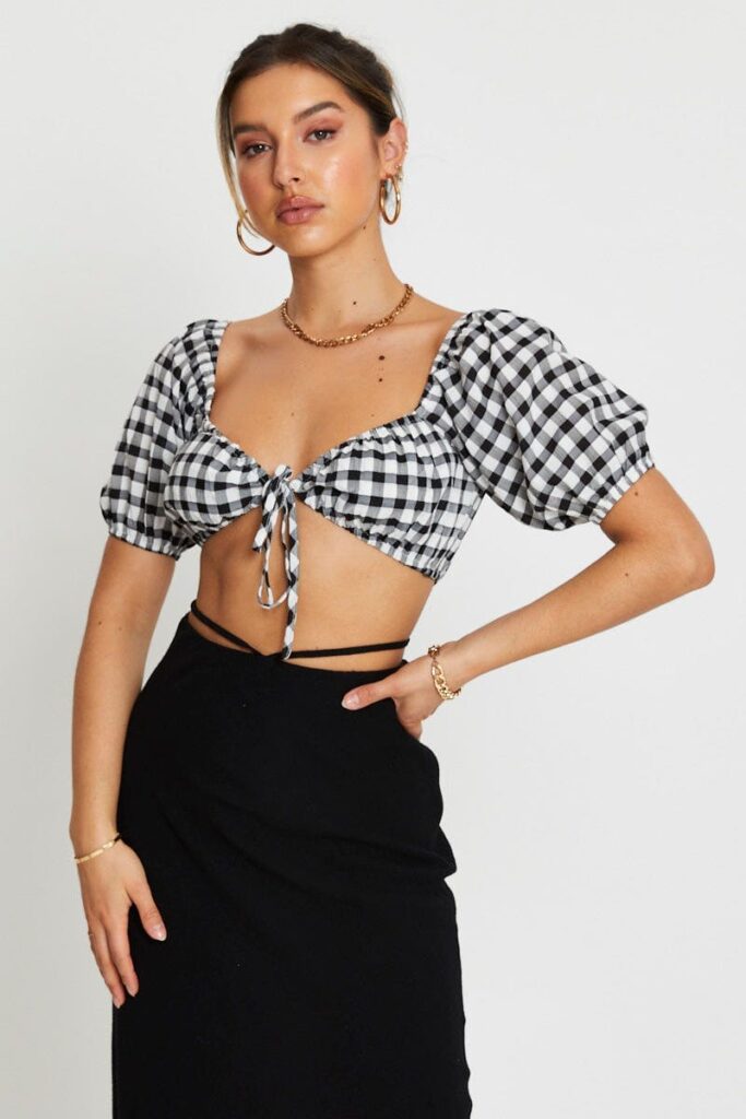 Season:AllStyle:CasualPattern:CheckFeatures: Gingham Print, Cropped Length, Tie Up Front, Puff SleevesNeckline: Off The Shoulder / BardotSleeve Length: 27CmBody Length:31CmFabric:PolyesterMaterial:PolyesterComposition: 100% PolyesterModel Details: Xxs / Aus 6 / Nz 6 / Uk 6 / Us 2, 170CmStyle Code:WC1748-10MB