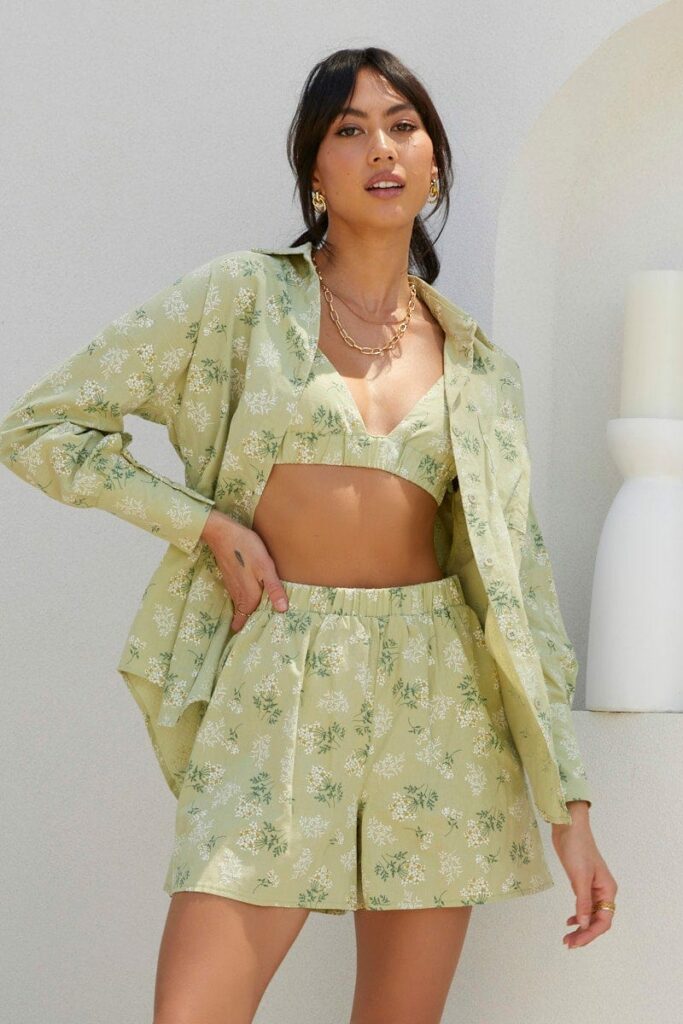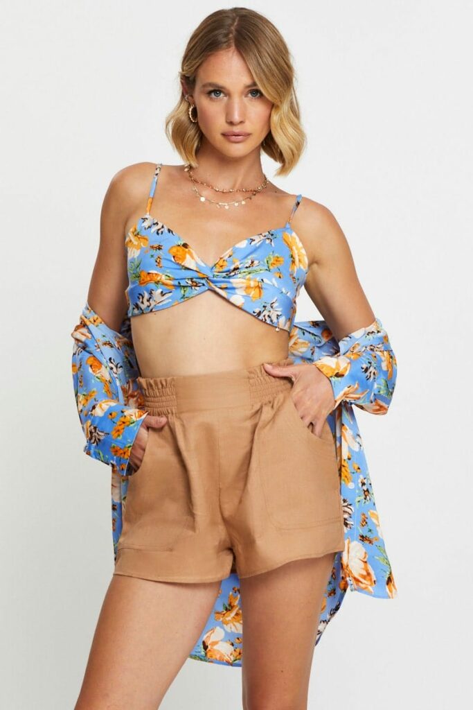 Season:AllStyle:CasualPattern:PrintFeatures: Floral Print, Elasticised Waist, Triangle Shape, Cotton BlendNeckline: PlungingBody Length:30CmFabric:ChiffonMaterial:CottonComposition: 65% Cotton, 35% PolyesterModel Details: Xs / Aus 8 / Nz 8 / Uk 8 / Us 4, 174CmStyle Code:WC10513X-31F4