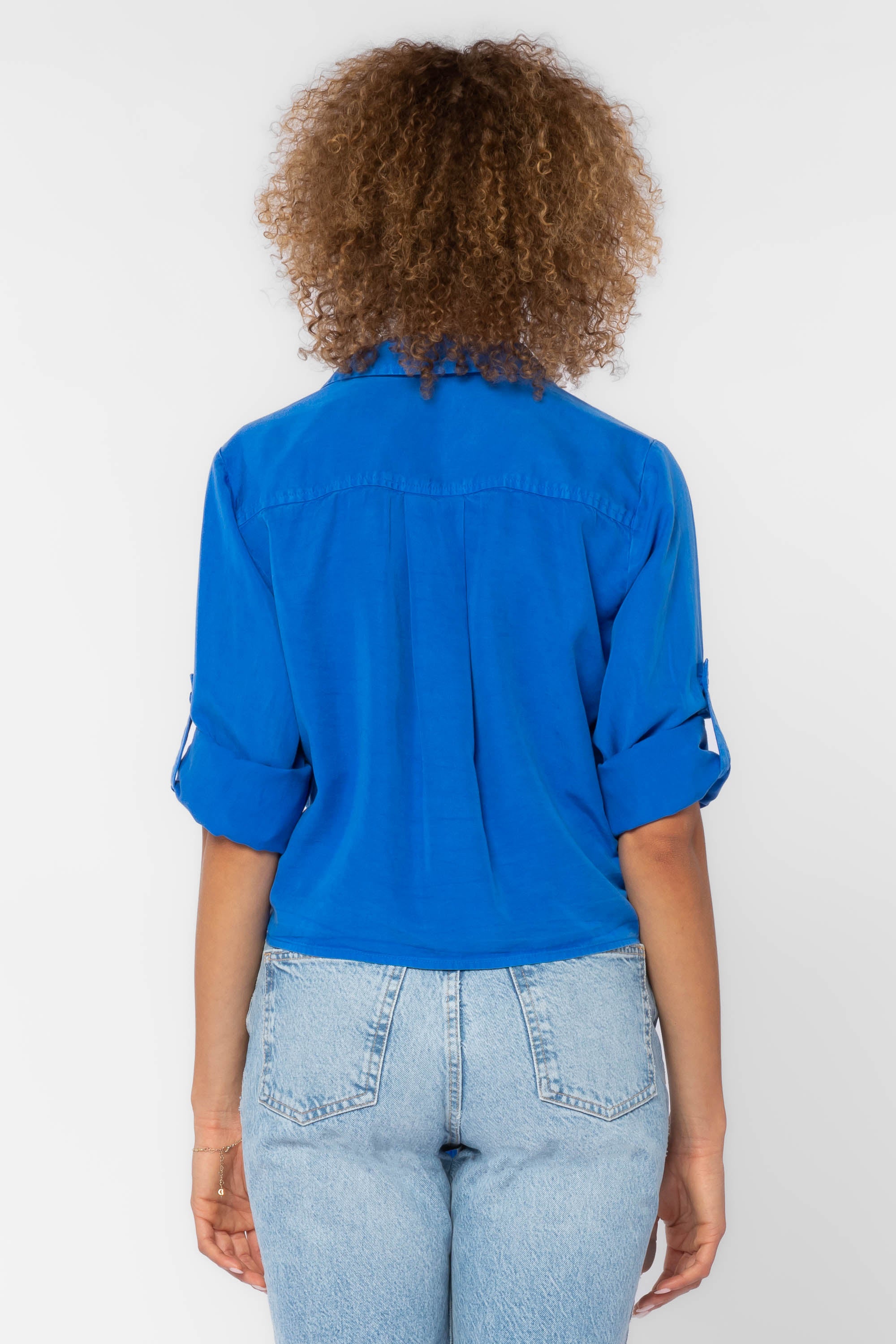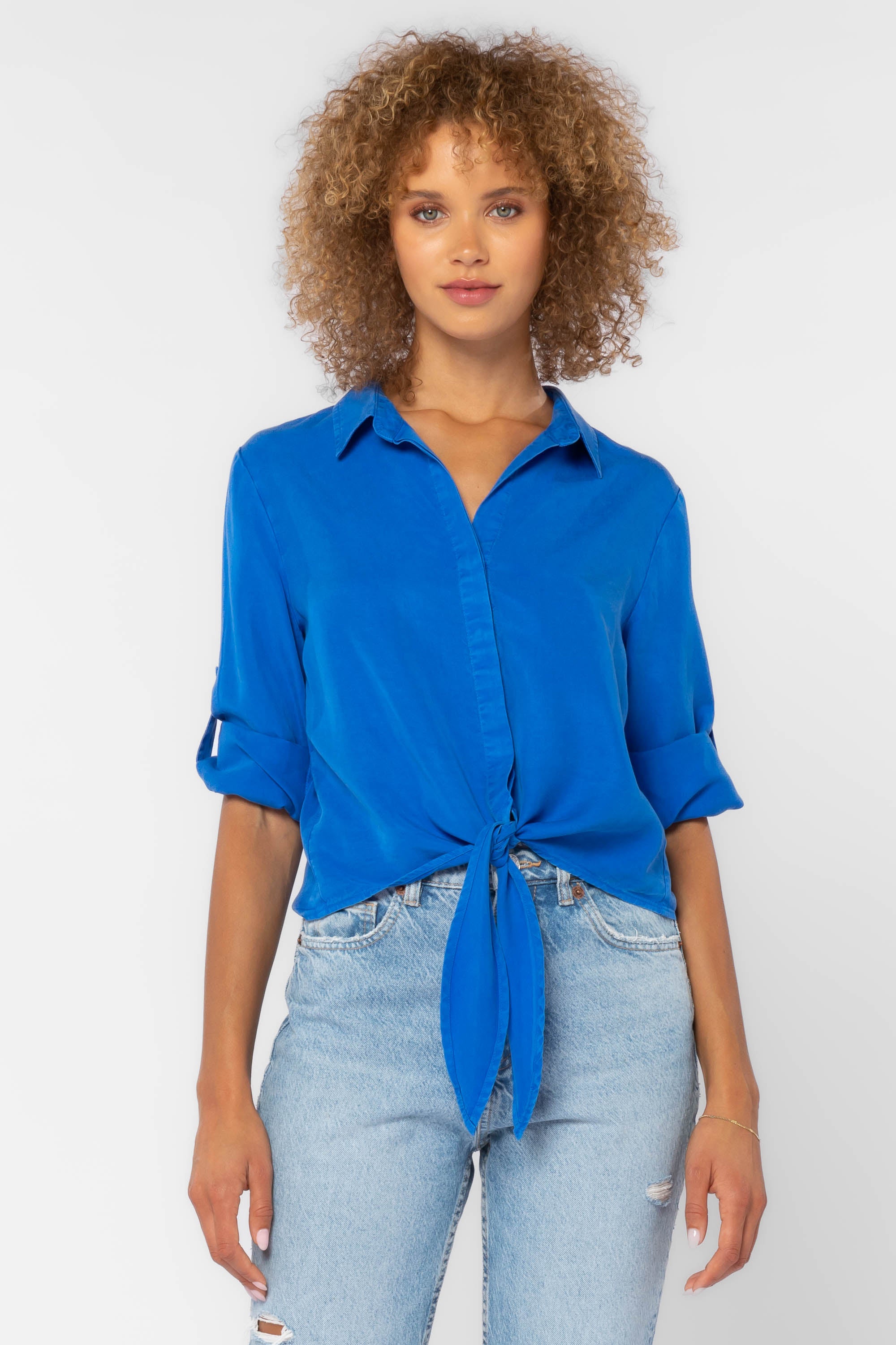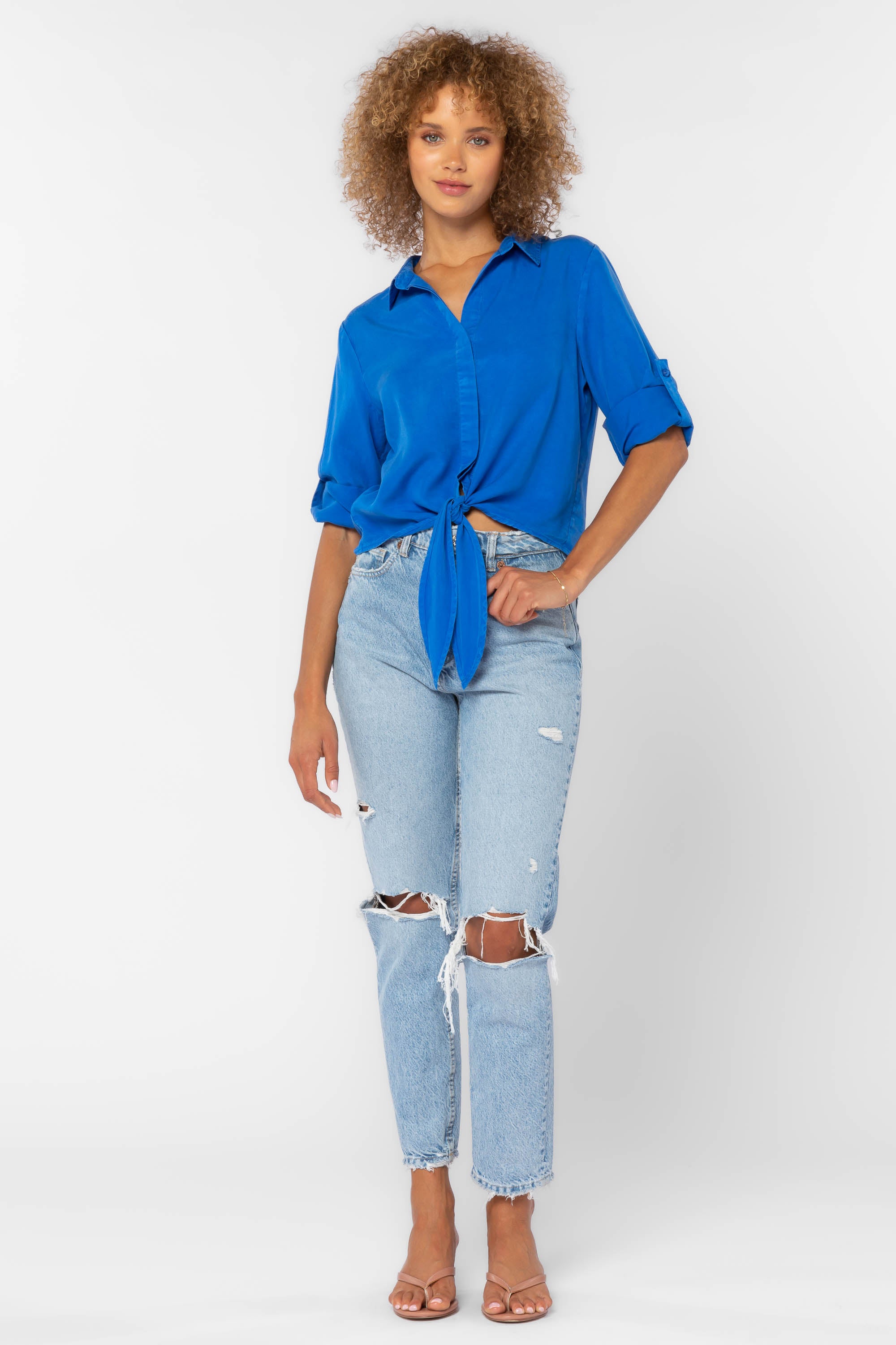 A lightweight and soft button-up shirt made from Tencel?. This long sleeve shirt features basic collar, v-neckline, button-up at front, covered placket, roll-tab sleeves, back pleat panel, front waist tie at hem, and slightly crop fit.